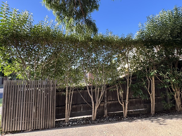 A row of weedy Privet and a narrow driveway makes it hard to park.
